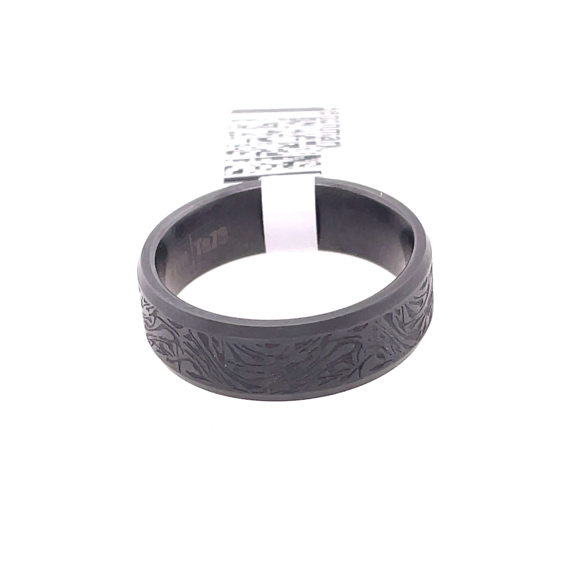 Benchmark 7mm comfort fit dark grey men's wedding band in tantalum with a faux mokume design center
