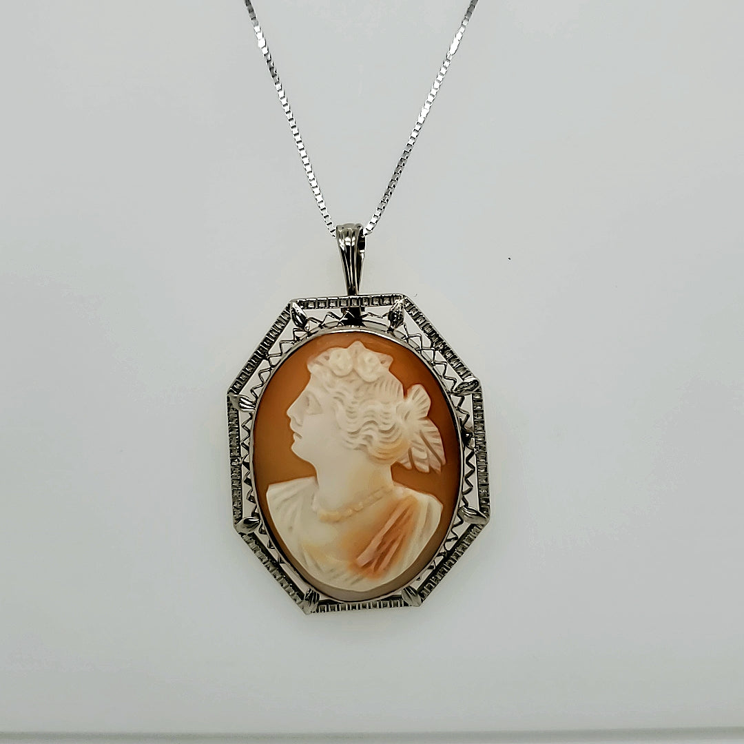 Vintage mid-century 14kt white gold filigree cameo brooch/pendant on a modern 14kt white gold chain